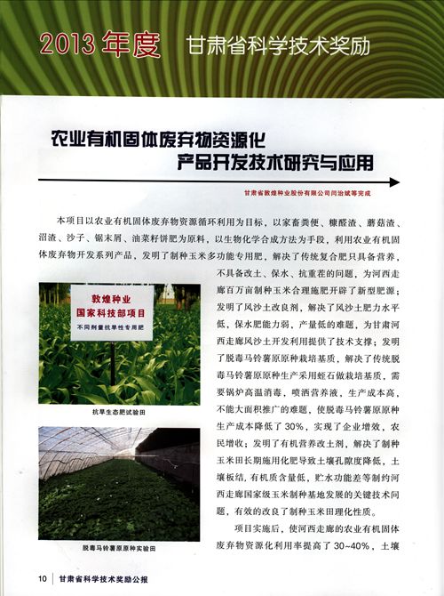 “農(nóng)業(yè)有機固體廢棄物資源化產(chǎn)品開發(fā)技術(shù)研究與應(yīng)用”喜獲甘肅省技術(shù)發(fā)明一等獎